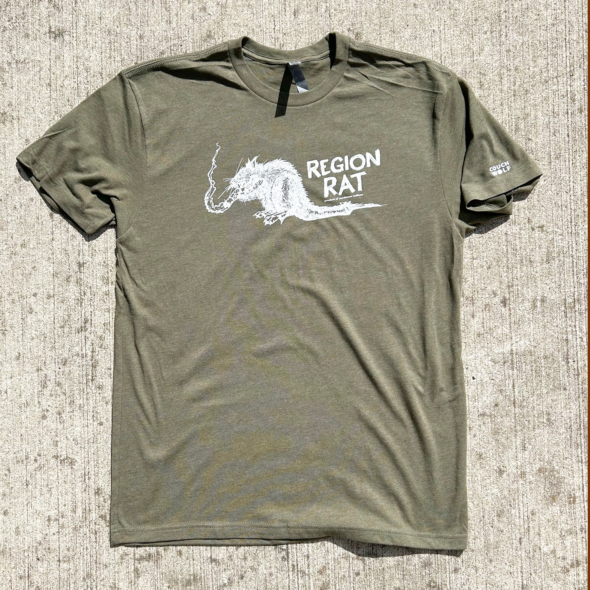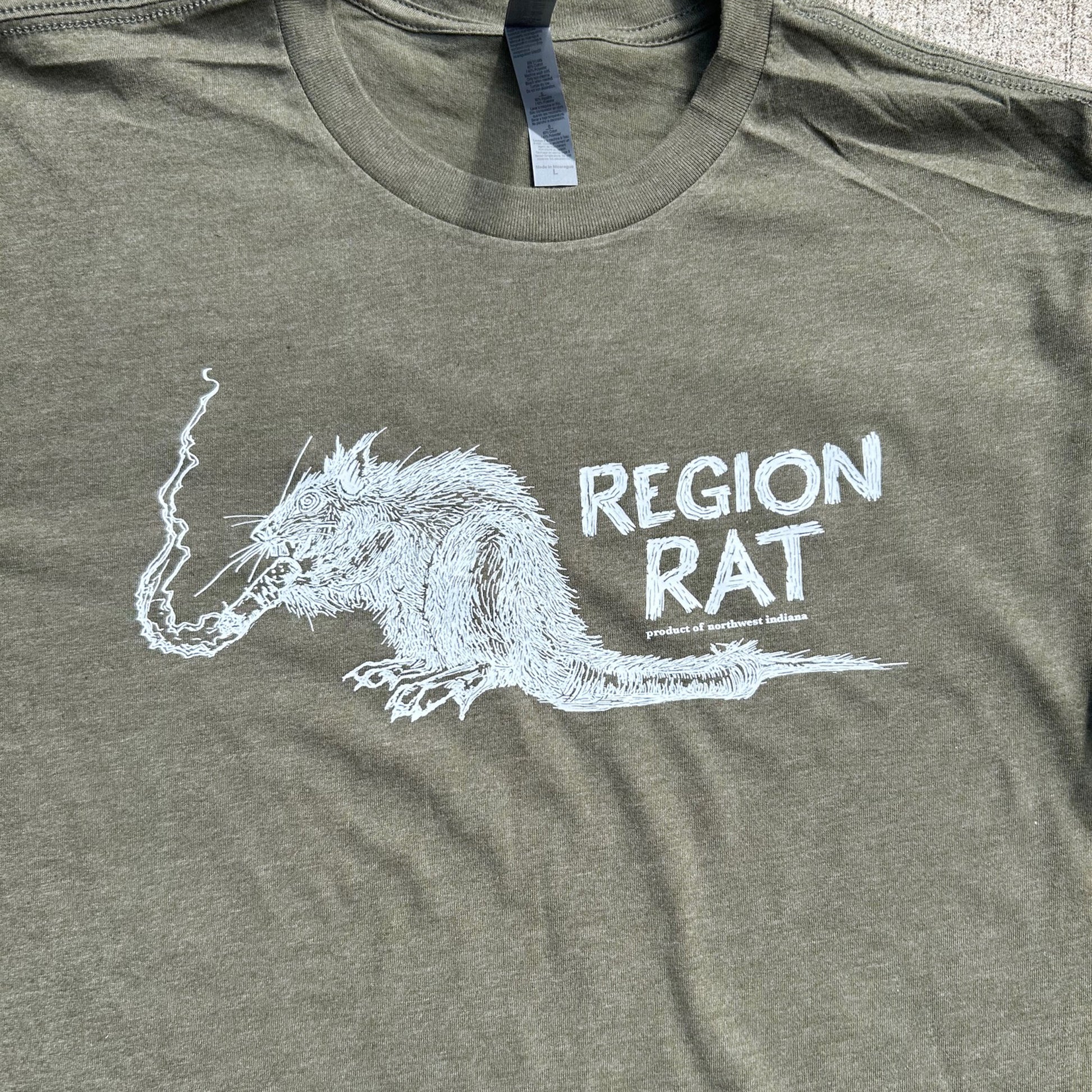Region Rat Product of Northwest Indiana T-Shirt. Show your love for the Region with this locally designed shirt, featuring a hand-drawn fiend rat smoking a cigarette. The Region Rat art is printed on the front, and has a gritty, scratchy vibe and say "Region Rat, product of Northwest Indiana. The back is blank. Represent the 219, NWI, Northwest Indiana. This super soft, premium fabric blend, unisex 60/40 cotton polyester shirt offers comfort and style. Perfect for being stuck in your car on 80/94 for extended periods, wishing you had taken the toll road. Designed and printed in the USA.