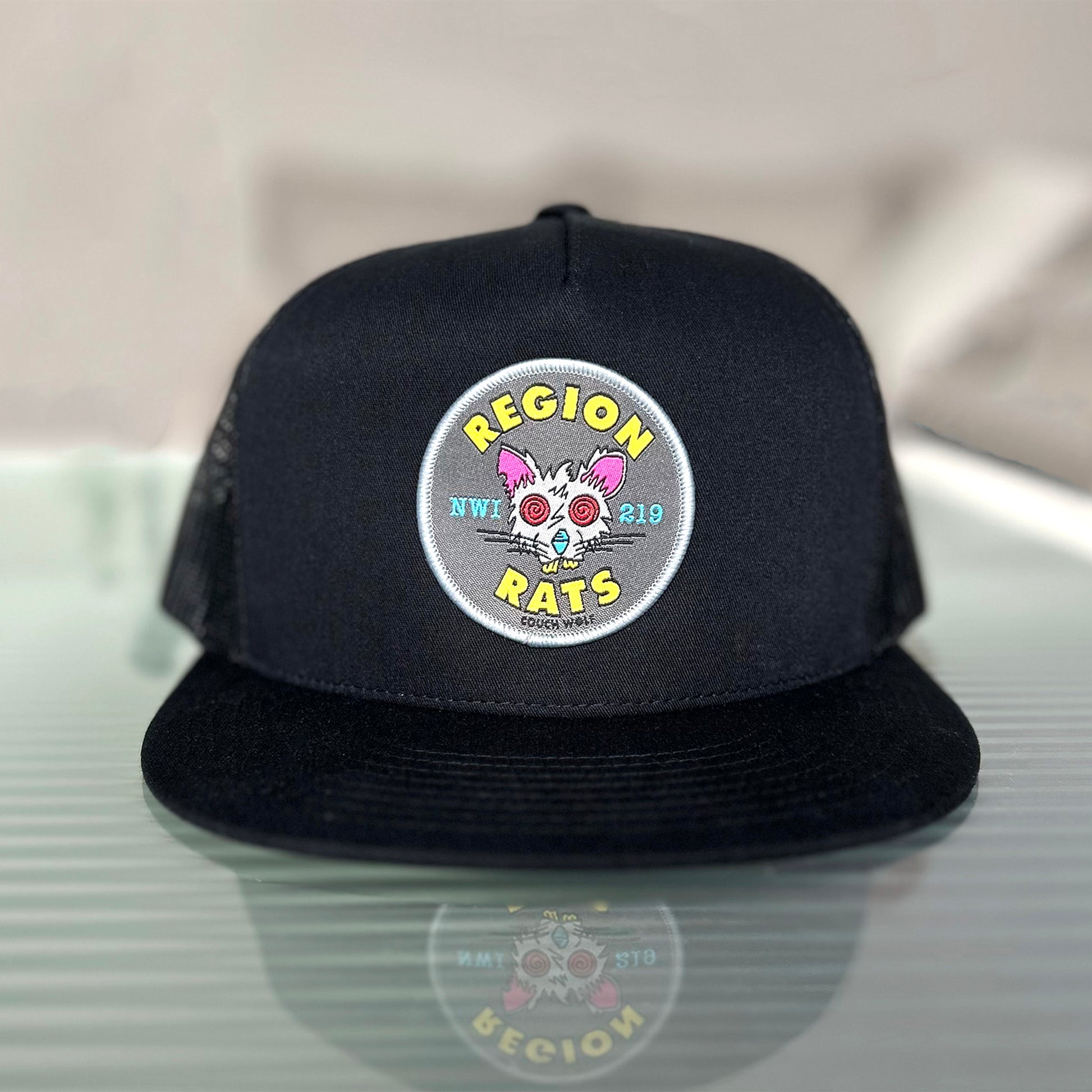 Region Rats Trucker Hat. Represent the Region in this stylish, high-quality, black snap back trucker hat with 2.5" Region Rats patch. Designed by local degenerate Northwest Indiana artist. The patch features hand drawn Region Rat art and says 'Region Rats NWI 219" with a subtle Couch Wolf logo beneath it.